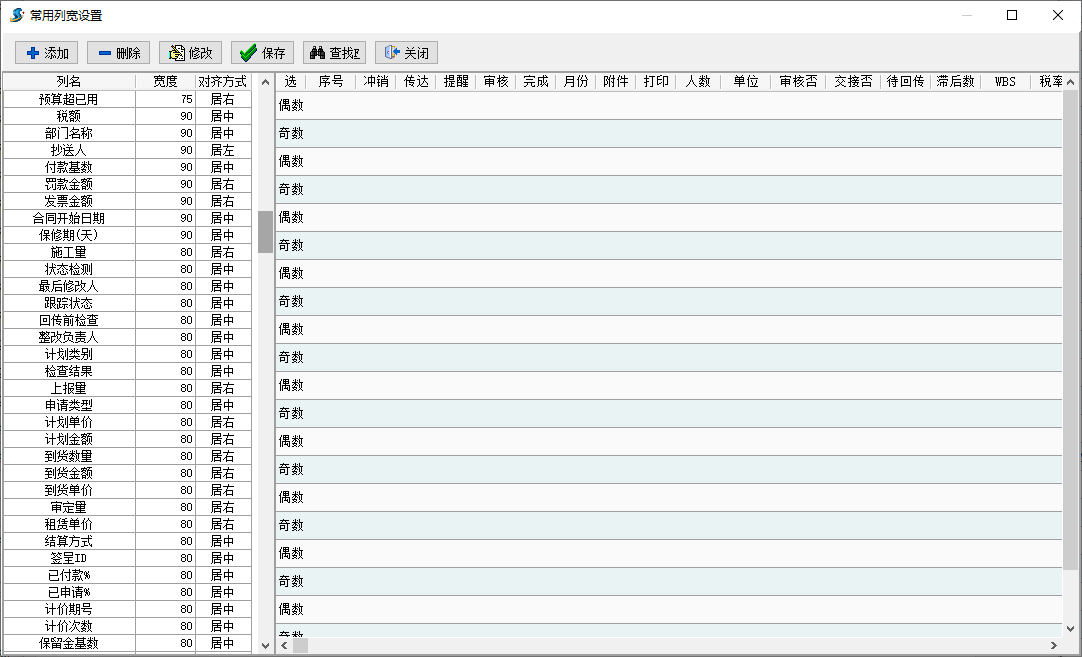 六、常用列寬設(shè)置 - 對(duì)列表或查詢(xún)表格中不同字段的列寬做單獨(dú)設(shè)置,分字段名、寬度和對(duì)齊方式3種設(shè)置,字段名必須與列表或查詢(xún)表格中的字段名一致,否則無(wú)法生效;寬度為字段的顯示寬度,原則為恰好或更好顯示當(dāng)前字段內(nèi)容為準(zhǔn);對(duì)齊方式分居中、居左和居右3種方式,原則上推薦數(shù)字類(lèi)居右顯示,其他字段可根據(jù)用戶(hù)個(gè)體習(xí)慣自行設(shè)置,設(shè)置界面圖如下: