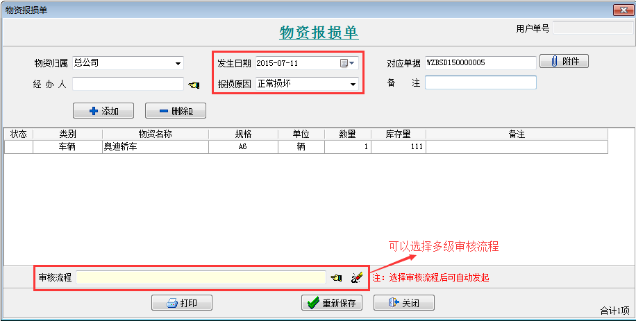 備注:當(dāng)借出的物資發(fā)生損壞,必須填寫物資歸還單后才可以執(zhí)行報損。