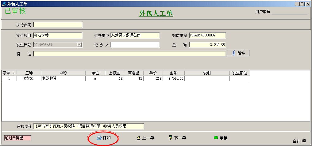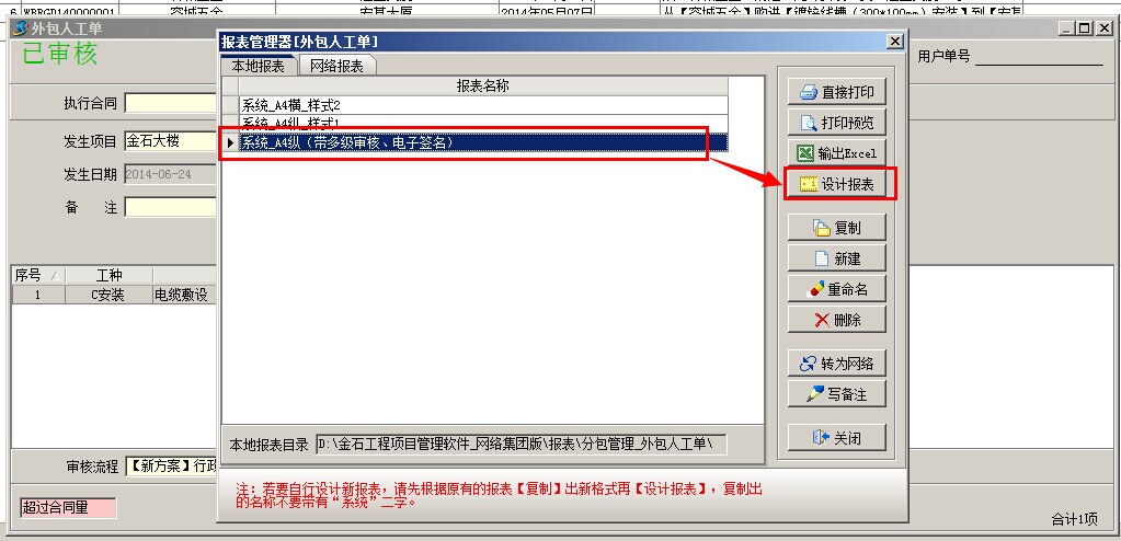 以下圖的外包人工單為例說(shuō)明,點(diǎn)擊打印,選擇帶電子簽名的報(bào)表,點(diǎn)設(shè)計(jì)報(bào)表