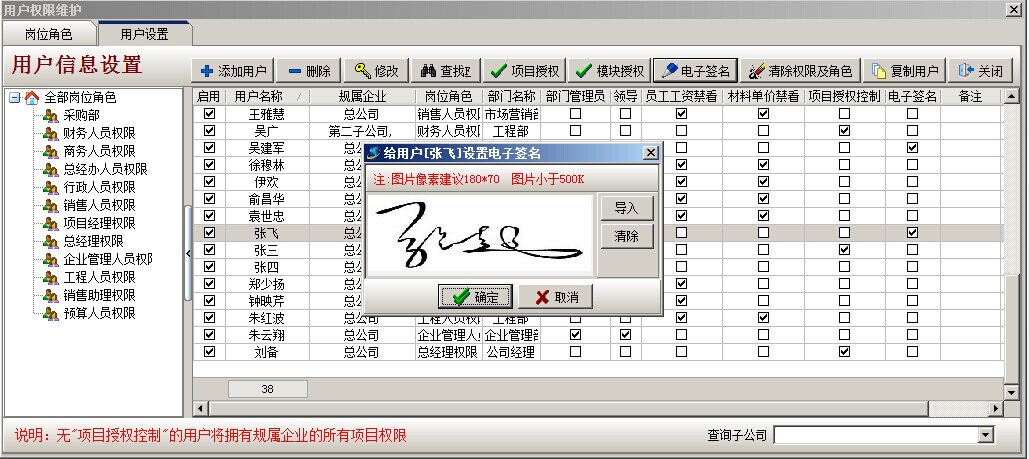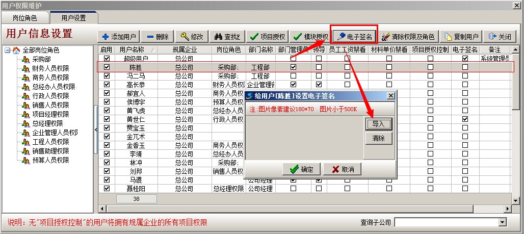 登陸超級(jí)用戶,選擇系統(tǒng)維護(hù)模塊,打開(kāi)用戶管理權(quán)限設(shè)置,選擇需要設(shè)置電子簽名的用戶,點(diǎn)上面的電子簽名,對(duì)應(yīng)導(dǎo)入提前設(shè)置好的電子簽名圖片(jpg格式)