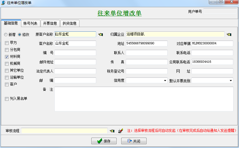 金石軟件增加往來(lái)單位增改單,可用于添加往來(lái)單位并可以進(jìn)行流程審批