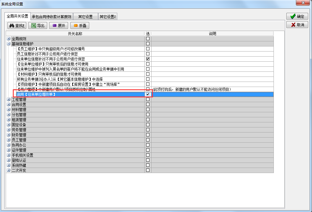 使用該功能之前需在【系統(tǒng)全局設(shè)置】中開(kāi)啟‘啟用【往來(lái)單位增改單】’,開(kāi)啟后可以使用往來(lái)單位增改單新增或者修改往來(lái)單位,同時(shí)往來(lái)單位維護(hù)禁止使用新增和修改功能。