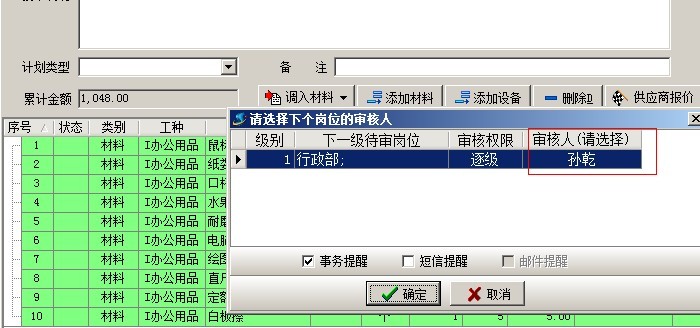 在多級審核業務單據中,填寫完業務單據內容后要選擇審核方案,審核方案選好后,點保存按鈕保存單據,這是會彈出待審人選擇窗口,如下圖,這時我們要選擇好下一級的審核人,選擇好后,那么該用戶就是業務單據的待審人。在審核中心和業務單據列表中就可以看到該業務單據。