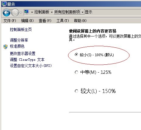 3. 在彈出的顯示窗口中選擇【較小S 100%(默認(rèn))】根據(jù)提示重啟系統(tǒng)后,界面就會顯示正常。