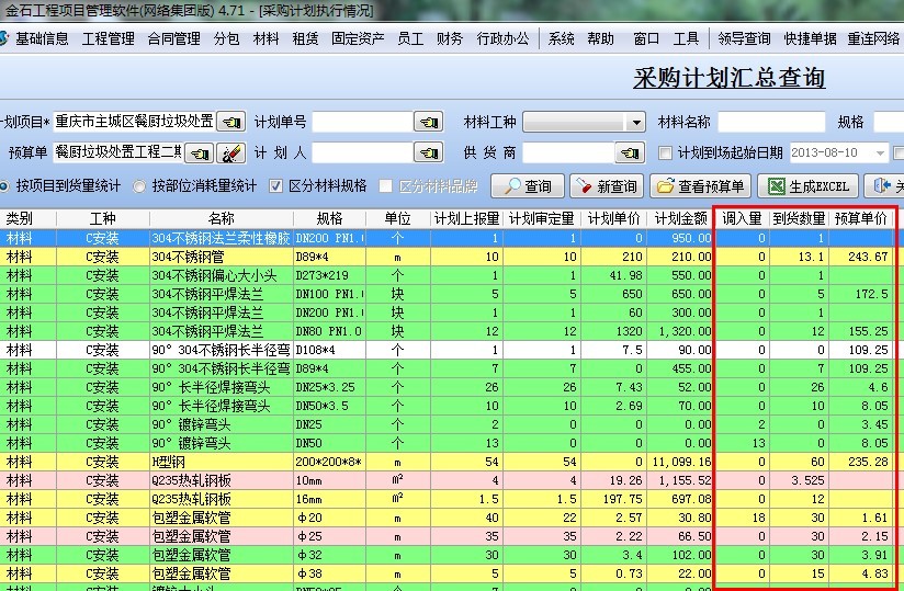 分析:公司給項目代購和調(diào)撥的主材費(fèi)通過【材料管理】-【采購計劃執(zhí)行匯總】來核對得出,(調(diào)入量+到貨量)*預(yù)算單價。如下圖: