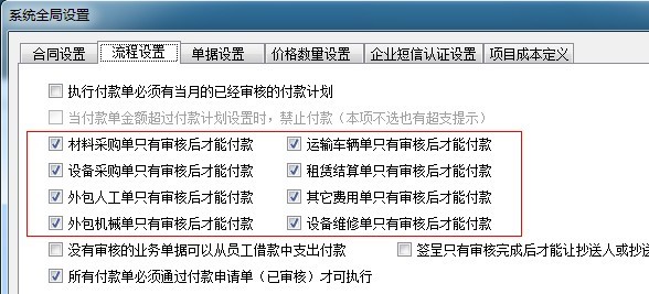 公司規(guī)定:只有審核后的單據(jù)才能提起付款申請,所以超級用戶已經(jīng)在【全局設(shè)置】中開啟了以下八個開關(guān):